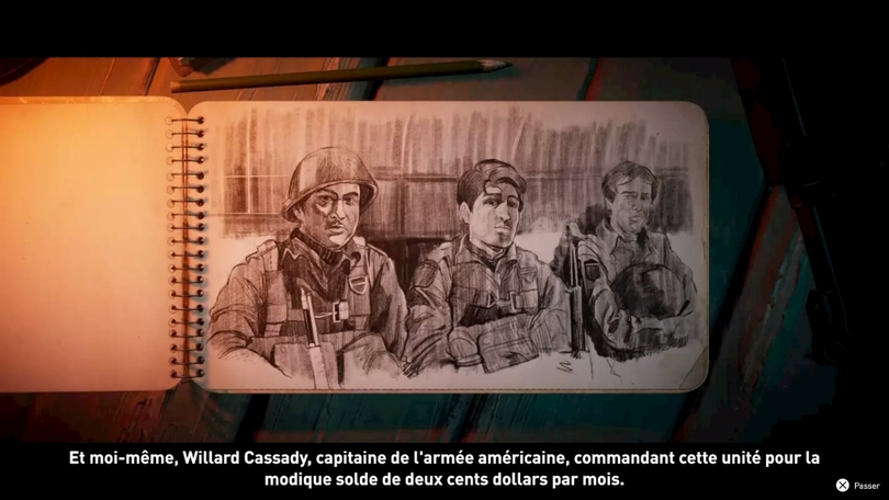 Le cadre est posé et même s’il n’y a pas de scénario a proprement parlé, le jeu est parsemé de petites cinématiques crayonnées destinées à présenter succinctement les différents personnages ou certaines des grandes phases de notre opération. Là encore, dans le seul but de mettre un peu de contexte, qui se révélera presque anecdotique pour les moins intéressés. Les autres en revanche pourront découvrir à certains moments des informations sur les manœuvres militaires de l’époque visant à préparer le Débarquement. Un petit plus pour les férus d’Histoire.