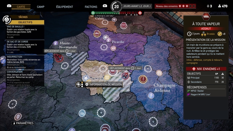 Toujours est-il que chaque département est la zone d’action de l’une des trois factions de la résistance : les radicaux, les gaullistes ou les criminels. En accomplissant des missions liées à leur territoire, vous gagnerez en affinité avec eux. Cette affinité nous donne accès à leur ravitaillement et plus la réputation est haute plus la qualité des produits disponibles (armes, tenues) sera élevée. De même, chaque département où la Resistance aura pleinement étendu son contrôle donnera divers bonus pour réussir à mener le Débarquement. Attention toutefois à la Gestapo qui reprendra les zones si on intervient pas dans les temps. Il faudra pour cela pour mener à bien la contre-offensive, réussir les missions et donc bien s’équiper.