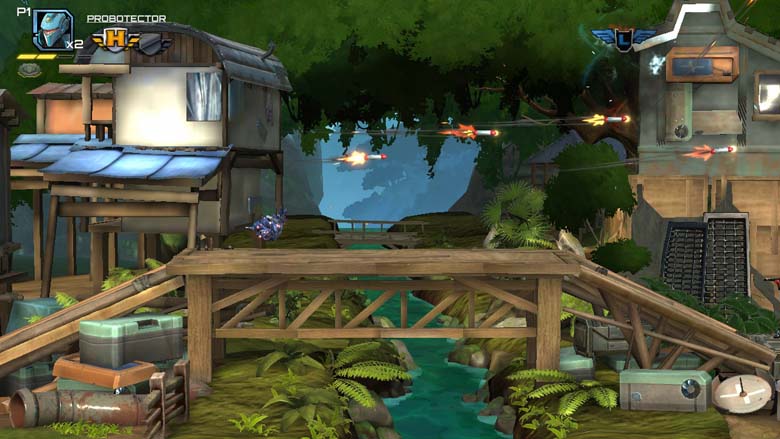 8 niveaux cela peut paraitre court, mais ceux-ci sont assez longs et WayForward n’a pas toujours été généreux sur les checkpoints. Du coup on recommencera encore et encore pour tenter de passer entre les balles tout en distribuant généreusement les nôtres. Et cette générosité sera boosté par des powers-up transformant votre arme en lance flamme, laser, lance missiles, lance grenade etc… Deux powers-up peuvent être stockés, augmentés et vous pourrez les alterner au besoin ou bien les consommer pour vous donner un pouvoir, le temps de quelques secondes, variant suivant le bonus consommé. On aurait juste aimé ne pas avoir à éviter certains bonus, car ceux-ci remplacent automatiquement celui utilisé et des fois, c’est dramatique.