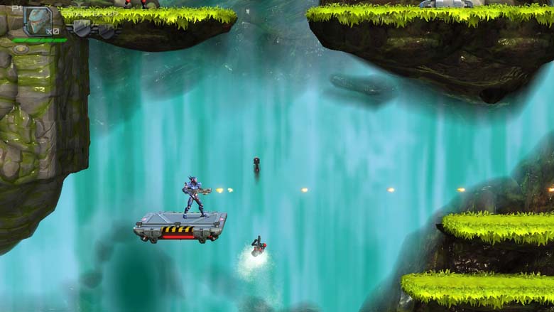 Et vous auriez bien besoin de ces bonus car la difficulté est bien au rendez-vous. Modulable sur 3 niveaux, il vous faudra aussi jouer contre la gravité car les phases de plateformes seront peut-être la source première de décès. Trois éléments qui contribueront à votre chute : une réactivité des personnages sur vos ordres de saut qui questionnera parfois, une physique de personne parfois un peu glissante lors de la réception sur une plateforme un peu étroite et une lisibilité pas toujours optimale. Encore que ce dernier point peut-être mis de côté car le but de Contra étant de mourir, votre expérience aura pris le relais.