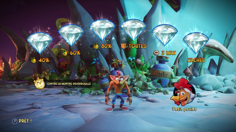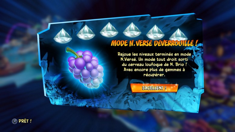 Côté gameplay, on retrouve des plate-formes à la old school, rappelant ce que l’on trouvait dans les précédents volets de la série, en apportant toutefois quelques nouveautés. Pour rappel, vous devez faire évoluer Crash et/ou Coco Bandicoot (et quelques autres personnages que nous vous laisserons découvrir) à travers les différents niveaux du jeu que vous traversez successivement. L’accès à chaque niveau se fait depuis une carte (un peu à l’image de ce que l’on avait dans le tout premier opus de la série) des différent(e)s îles/mondes que l’on traverse. L’objectif des différents niveaux est de détruire la totalité des caisses de fruits Wumpas (qui se récoltent d’ailleurs plus rapidement et qui ne s’envolent plus lorsqu’on réalise une tornade accidentelle trop proches d’elles) et d’obtenir la gemme cachée, si possible sans perdre plus de trois vies (hahahahaha), pour compléter les niveaux à 100% et ainsi débloquer des skins fantaisistes pour nos marsupiaux favoris (à noter qu’ils ne sont là que pour le côté esthétique). A noter que d’autres gemmes sont accessibles en mode N.Versé. Des gemmes colorées sont également à dénicher pour accéder à un niveau secret. Bien entendu, les séquences bonus à travers les niveaux sont toujours présentes et permettront une petite trêve dans votre progression, afin de collecter toutes les caisses présentes. On retrouve également le mode Contre-la-Montre : un speedrun où vous devez battre le meilleur temps symbolisé par les fantômes des développeurs du jeu en une seule vie. Enfin, vous pourrez également collecter des K7 flashbacks (le guide est à retrouver sur cette page) qui nous montrent les entraînements de Crash lorsqu’il était encore sous le joug du Dr. Neo Cortex (pour rappel, Crash était un bandicoot normal avant d’être capturé par le docteur qui l’a soumis au Rayon-Evolvo, afin de faire de Crash son esclave et le chef d’une armée d’animaux mutant, grâce à qui Cortex aurait du dominer le monde. Cependant, le marsupial a réussi à s’enfuir et, avec son fidèle protecteur Aku aku, a rejoint la voie du bien.