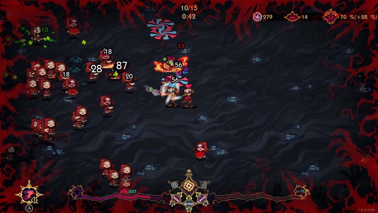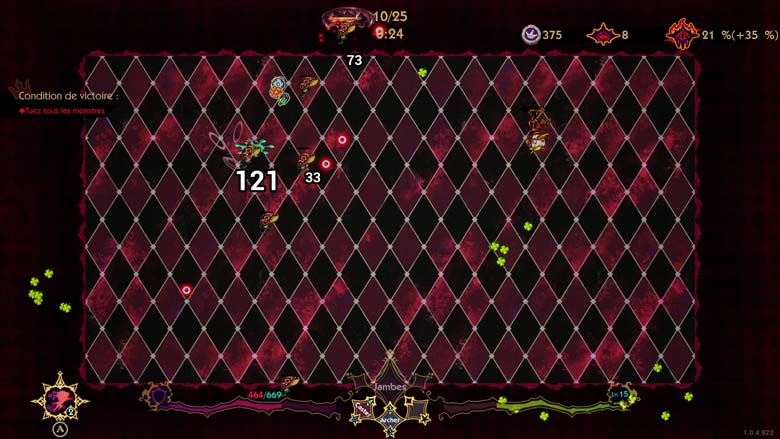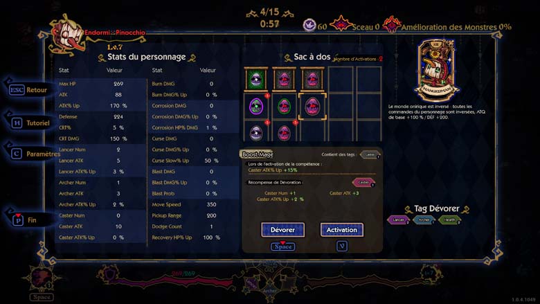 On retrouve le fait de ramasser XP, pièces et items même si tout sera récupéré en fin de vague. Qui dit XP dit passage de niveau avec choix d’avantage et on se retrouvera alors à chercher les synergies intéressantes. On gagnera des œufs et il faudra choisir entre l’activer, ne rien en faire pour le moment ou le manger.