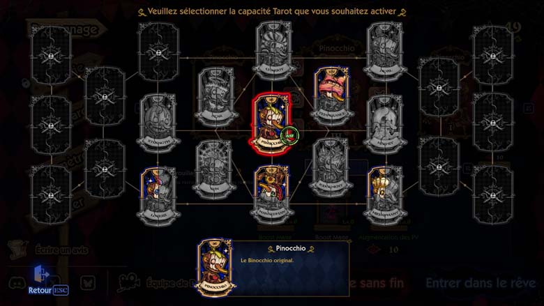 Contrairement à la plupart des jeux du genre, Dark Fairy Tale Dreamland Survivors nous limite à un seul personnage jouable : Pinocchio, la marionnette en bois qui a le nez qui grandit quand elle ment. Vous débloquerez des cartes de tarot qui fonctionnent un peu comme des classes alternatives. Chaque carte offre des capacités uniques : comme invoquer un clone, faire apparaître périodiquement une étoile qui attaque les ennemis.