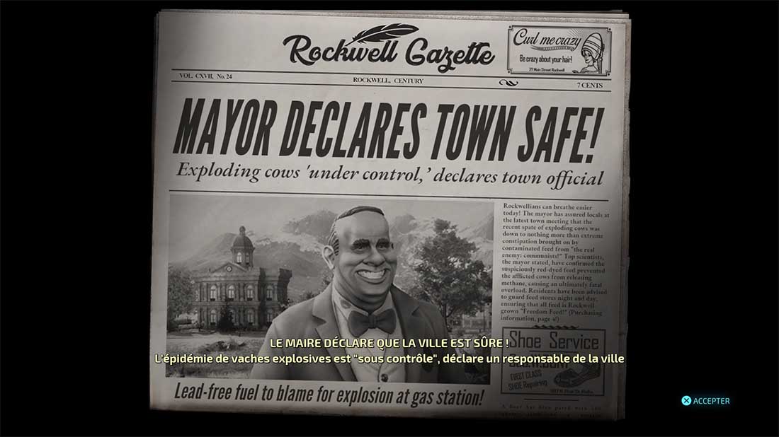 Comme dit plus haut, dans ce jeu, nous sommes téléportés en plein milieu des États-Unis des années 1950 en plein milieu des découvertes de Roswell ou encore de la paranoïa autour de la menace communiste. Cela se ressent beaucoup avec des personnages comme le Général que nous combattons pendant une partie du jeu ou encore avec les journaux qui accompagnent l’écran de fin de mission et qui attribue nos méfaits à un espion soviétique. Destroy All Humans joue à fond la carte de la dérision et tourne au ridicule cette période de l’Histoire américaine, avec aussi certains symboles comme les Drive In ou encore les chaînes de Fast Food. L’écriture du titre est plutôt bien pensée et l’humour omniprésent rend l’expérience très agréable pour ceux qui ne connaissaient pas la licence ou seulement de loin. Le scénario ne se prend pas non plus au sérieux et c’est tant mieux tellement le ton décalé du jeu est une réussite.