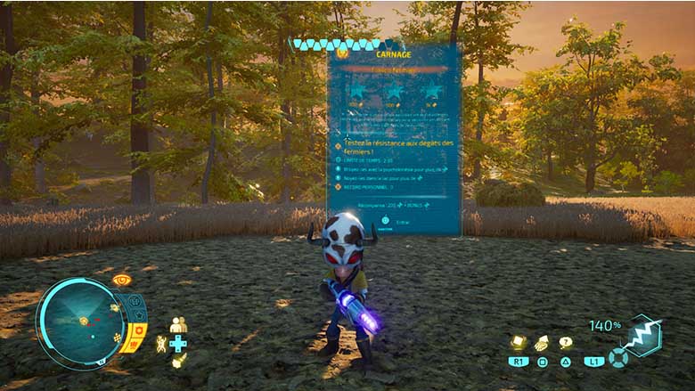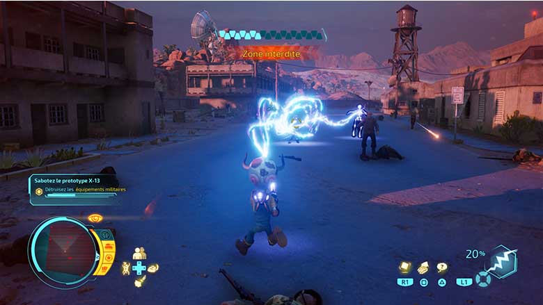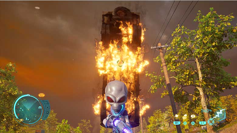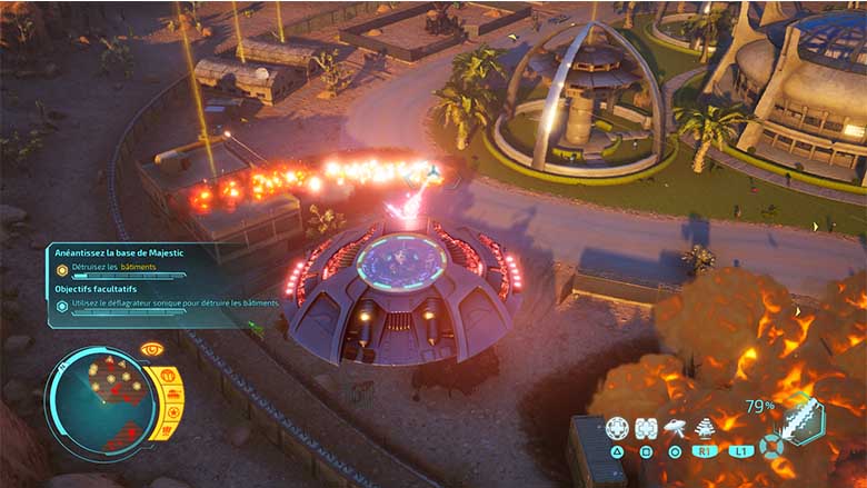 Les phases en soucoupe volante sont aussi de grands moments où il nous faudra simplement tout détruire avec notre arsenal – qui se diversifie grandement au cours de l’aventure, empêchant là encore un sentiment de répétitivité. Au cours de plusieurs missions, Pox nous demandera de prendre les commandes du vaisseau pour détruire des bâtiments ou affronter une armée de chars ou encore un robot géant. Dans tous les cas, la soucoupe est agréable à manier et même si le contrôle a de quoi désorienter au début, avec des déplacements horizontaux avec le joystick gauche et des déplacements verticaux avec le joystick droit, on finit par s’habituer à ces contrôles. Les contrôles du jeu, que ce soit en soucoupe ou à pieds sont logiques dans l’ensemble et c’est vraiment agréable à prendre en main.