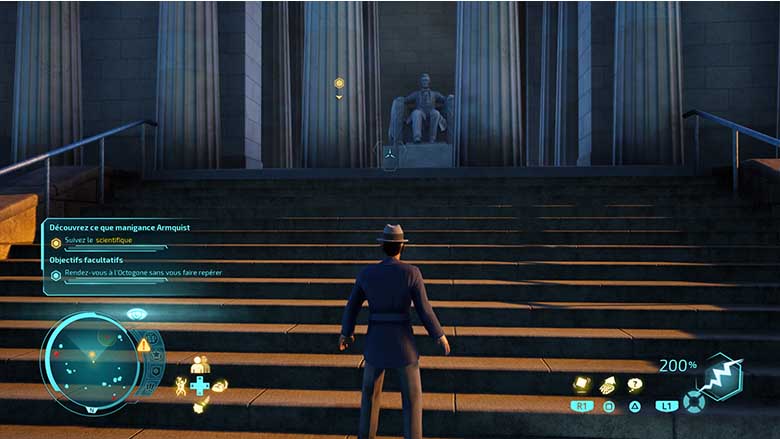 Un autre pan du gameplay nous demande de prendre l’apparence d’un humain pour infiltrer une zone ou simplement pour se fondre dans la masse et éviter d’alerter la police. Ces phases nous demandent alors de faire un peu plus attention, notamment aux hommes en noir qui peuvent perturber notre déguisement et nous faire apparaitre sous notre vrai visage. De temps à autre, il nous faudra aussi recharger le déguisement en allant fouiller dans la tête d’une personne se trouvant dans les parages. Ces moments nous permettent ainsi de découvrir ce que ces personnes des années 1950 ont dans la tête et là encore, le côté loufoque du jeu frappe fort. On est dans de l’infiltration pure et il faudra utiliser les autres pouvoirs de Crypto pour mener à bien notre mission, comme effacer le souvenir de notre passage des éventuels témoins, charmer un humain pour l’amener dans un coin retiré ou créer une diversion en poussant un humain à faire la poule. Dans tous les cas, ces phases d’infiltration sont nombreuses au cours de missions, mais elles ne se renouvellent hélas qu’assez peu, ce qui est dommage même si cela reste plaisant de chercher à infiltrer une base de l’armée dans la zone 42 en se faisant passer pour un soldat lambda.