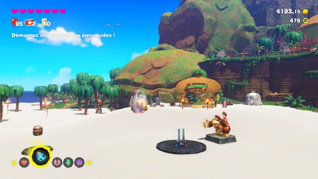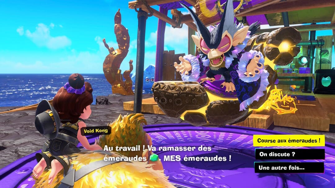 Néanmoins, on ne vous recommandera pas forcément l’acquisition de l’extension du jeu Donkey Kong Bananza intitulé « Île de DK et Course aux émeraudes » tant il paraît hors-sol autant dans l’idée que dans la réalisation. Dans l’idée, cela semble ahurissant que le concept ait été retenu. Cela m’a fait presque mal au coeur d’entendre Pauline dire « qu’est-ce que t’en dis DK, ça peut être amusant non ? ». Qu’est-ce qui peut être amusant ? Travailler pour un vilain qui ne cesse de proclamer son amour pour la fortune qu’il amasse, et y contribuer… Quel est le message derrière ? Venant de Nintendo, j’ai trouvé ça très surprenant, très douteux comme choix.