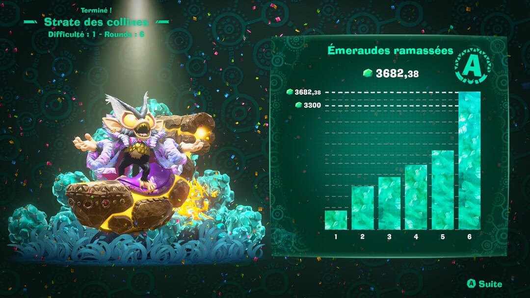 Pour ne pas que vous sentiez trop la monotonie des sessions de gameplay, vous gagnez des bonus quand vous trouvez notamment des fossiles. Que permettent-ils ? Détruire plus efficacement, trouver plus de coffres, faire apparaître plus d’émeraudes, augmenter votre multiplicateur, ou gagner plus de récompenses en battant certains ennemis. Bref, rien de folichon ni d’innovant à part le mode de jeu en lui-même. Honnêtement, c’est étrange de se dire que le jeu parvient à nous ennuyer avec une recette qui a fonctionné dans le jeu de base : la destruction en totale liberté.