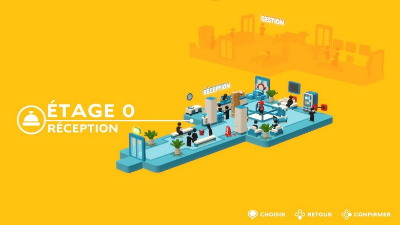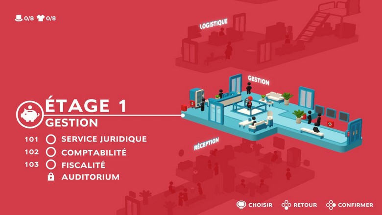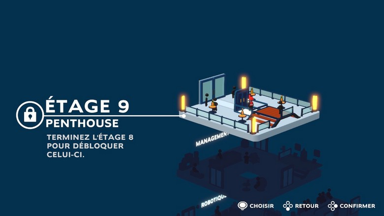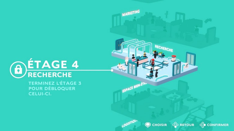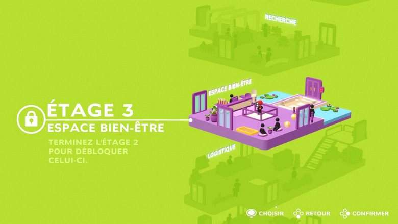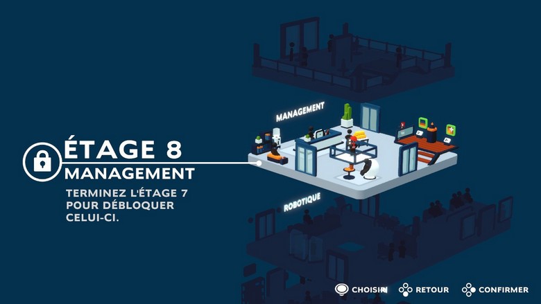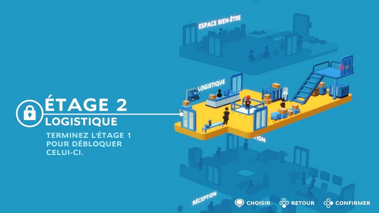 Good Job! est composé de neuf étages (10 en comptant le rez-de-chaussée) qui disposent chacun de trois niveaux. Une fois ces derniers accomplis, ils débloquent un quatrième service qui vous permettra de réinvestir ce que vous avez « appris » sur cet étage.