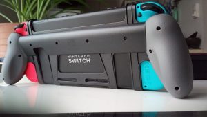 En revanche, les plus flemmards d’entre vous (dont votre serviteur fait partie) seront déçus d’apprendre que ces poignées rendent la Switch un peu trop épaisse pour que celle-ci rejoigne son dock en restant habillée de la sorte. Inconvénient qui nous parait finalement logique pour des raisons de solidité de l’ensemble, il faudra donc retirer cet accessoire avant de la docker à nouveau. Avantage : la coque peut servir à ranger ces poignées quand vous ne vous en servez pas, celle-ci étant prévue pour.