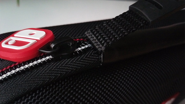 Commençons par le commencement, et surtout, parce qui se repère en premier dans ce lot : la coque. En ce qui la concerne, nous sommes ici face à un produit de bonne facture, avec des parois solides qui protègent efficacement son contenu. Visuellement, le produit est assez joli, avec ce qui semble être du nylon tressé (ou un matériau qui y ressemble). Au niveau des fermetures, là encore, on constate que les finitions sont de qualité, avec des coutures robustes et un fermoir à l’effigie du logo de la Switch facile à prendre en main. Au niveau de la poignée, celle-ci offre une bonne résistance même en forçant dessus comme une brute (ce que vous n’êtes pas censés faire, mais ça donne une idée de la robustesse de l’ensemble).