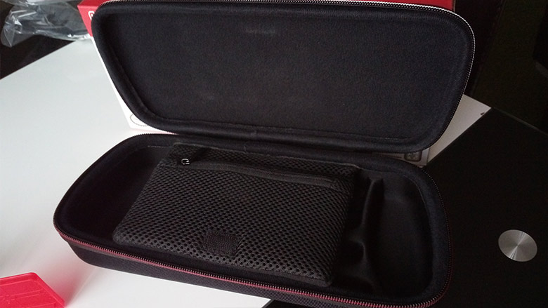 A l’intérieur, le constat est grosso modo le même : Bigben n’a pas lésiné sur les détails. Le revêtement intérieur est une sorte de velours doux qui ne maltraitera pas le contenu placé à l’intérieur de l’objet, même remarque avec la pochette intermédiaire qui possède ce même velours au niveau du contact avec l’écran et qui est composé d’un filet en tissu avec une texture de type mousse synthétique sur le devant. Disposant d’une fermeture, la pochette en question ne laissera pas se balader vos accessoires en cas de transport un peu chaotique.