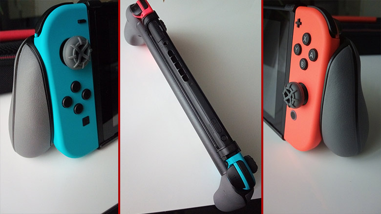 Mais passons désormais à ce qui est certainement l’accessoire-star du lot : les poignées. Conçues pour améliorer le confort de jeu en mode portable, ces poignées clipsables qui pourraient passer de prime abord comme le gadget encombrant de service se révèlent étonnamment pratiques. Recouvertes d’une matière antidérapante, les poignées tiennent bien en main, et leur forme – bien qu’un peu petite pour des mains d’adulte – permet de ne plus se faire mal au creux de la main avec le coin arrondi des Joy-Cons. Le système d’attache se place et se retire très facilement, bien que nous conseillons tout de même d’être attentionné avec cet accessoire pour éviter d’abimer les attaches en question dont le plastique pourrait rapidement être abimé par des manipulations indélicates.