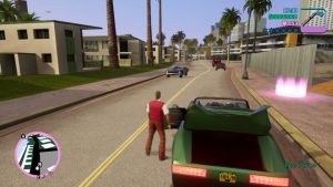 Du côté positif : on s’aperçoit assez vite que l’effort fourni sur les effets de lumière est payant, tout comme une profondeur de vue largement améliorée avec la disparition du fameux brouillard limitant. Idem sur certains décors, les bâtiments semblent un peu moins redondants et la végétation (notamment dans Vice City dont l’environnement s’y prête particulièrement) semble plus luxuriante. Enfin côté confort de jeu, l’ajout de points de contrôle dans certaines missions rend l’aventure plus agréable tout comme un mode de visée assoupli par rapport aux jeux originaux et l’ajout de la fameuse roue des armes héritée des opus plus récents permettant des combats plus dynamiques et préparés en laissant un temps de pause pour choisir la bonne manière de déconstruire ses opposants.
