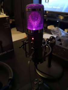 Autre chose, une fois activée, le micro prend une nouvelle allure et personnellement, je l’ai trouvé vraiment appréciable. Effectivement, une lumière se dégage et elle alterne différentes couleurs. Sur les deux photos du dessus, vous pouvez constater du bleu et du violet sous cette grille éclairée mais surtout, les couleurs sont belles et renforcent le design élégant du microphone. On se retrouve ainsi avec cinq couleurs et un cycle RGB, ensuite il est possible de recouvrir le tout.