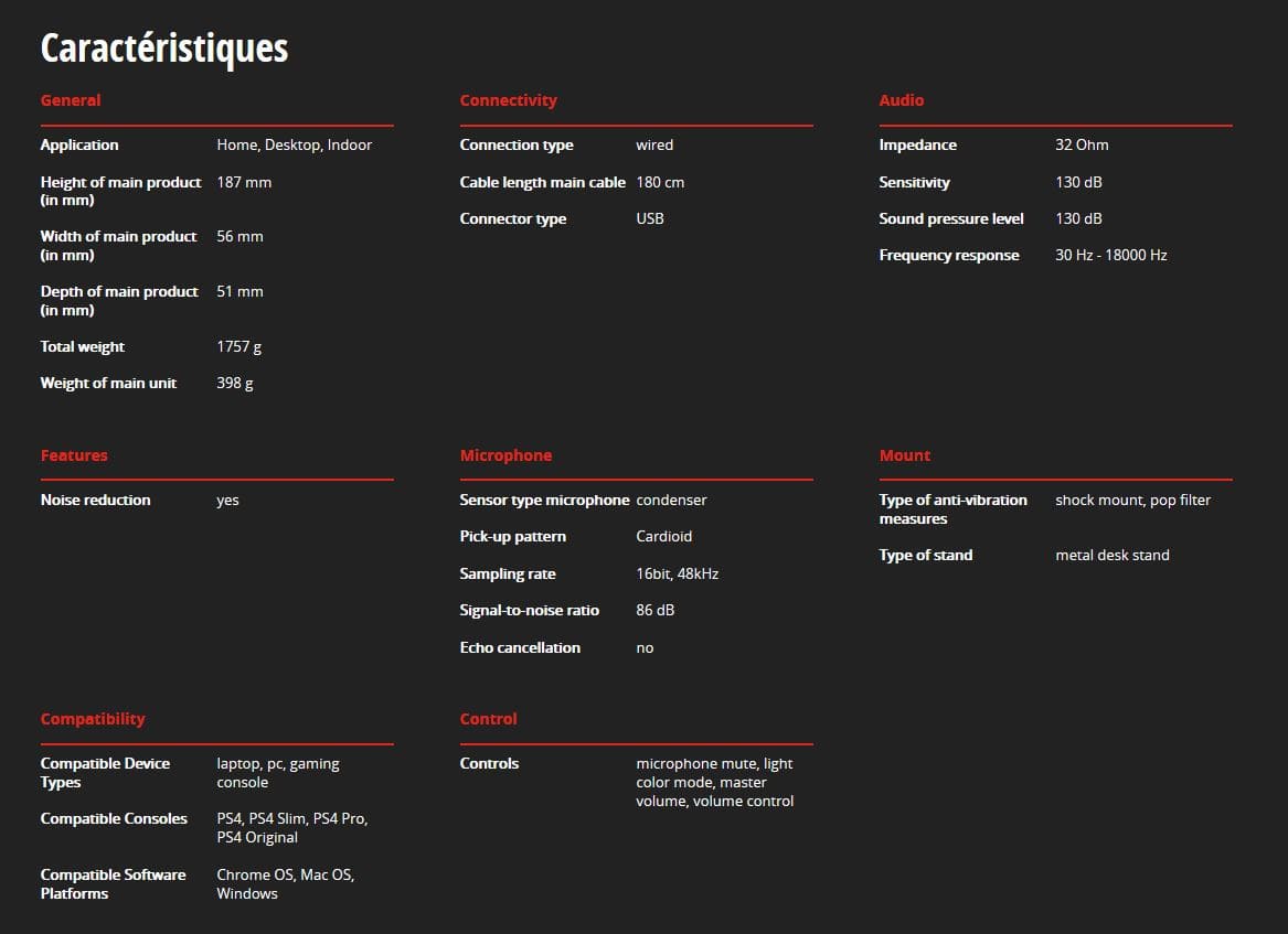 Pour la précision, on vous laisse avec les trois images. La première image illustre parfaitement le port USB du micro, la seconde la grille éclairée avec la protection. La dernière rentre dans tous les détails techniques afin de présenter les caractéristiques du micro.