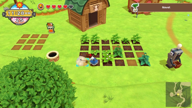Harvest Moon : Un Monde à Cultiver essaie de s’imposer comme un monde semi-ouvert. On regrette cependant que les cartes ne soient pas plus lisibles : que ce soit la mini-carte ou celle présente dans les menus, elles ne permettent pas de s’orienter correctement, et surtout, ne nous indiquent pas où se situe les animaux rencontrés, ni dans quelles régions trouver les graines à amasser. Dommage. Vous pouvez néanmoins vous déplacer plus ou moins librement via un système de jauge d’endurance (représentée par des cœurs qui s’épuisent à chaque action que vous réalisez, mais que vous pouvez remplir en mangeant certains de vos aliments ou en allant dormir), tout en cherchant à remplir les différentes requêtes transmises par les villageois(directement ou par courrier). L’un des points essentiels du titre est donc la culture, et force est de constater que la gestion des lopins de terre ne soit pas des plus optimales. En effet, il s’agit d’un quadrillage où l’on ne peut malheureusement pas utiliser le pad directionnel, perdant en précision : on se retrouve donc trop souvent à effectuer l’action sur le mauvais lopin. Pas des plus graves, certes, mais tout de même assez fréquent pour finir par nous agacer quelque peu. Fort heureusement, plein d’autres activités sont disponibles et nous font rapidement oublier ces petits désagréments : exploration, élevage, vente, cuisine…
