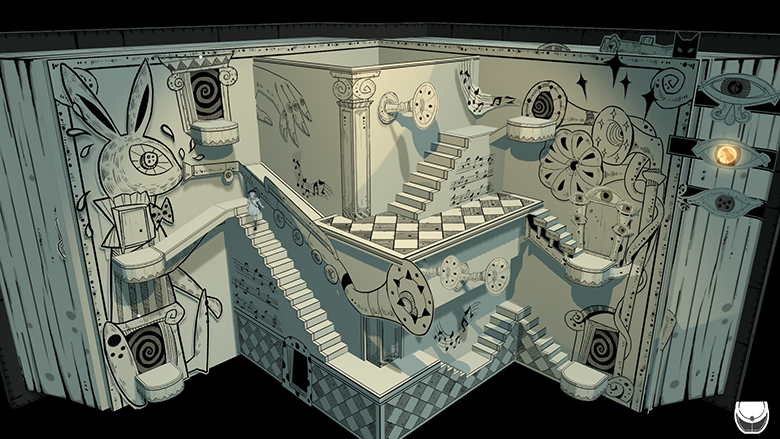 Comme bien souvent pour ce genre de jeux, c’est le gros point fort. Les niveaux, en noir et blanc, sont magnifiques, que ce soit dans leur disposition, leur ambiance ou leur esthétisme. Iris.Fall réussit à se renouveler tout en gardant une harmonie, une cohérence. Mention spéciale au niveau du livre animé qui donne envie de tourner les pages juste pour le plaisir des yeux et des oreilles (il y a d’ailleurs un succès à le faire un certain nombre de fois). Car oui la bande-son est tout aussi bonne. Nous sommes habitués à des musiques répétitives, parfois même à contre-emploi et empêchant de rester concentré sur l’énigme. Ici l’ambiance sonore est adaptée aussi bien au genre (puzzle game donc) qu’aux décors et à l’ambiance générale.