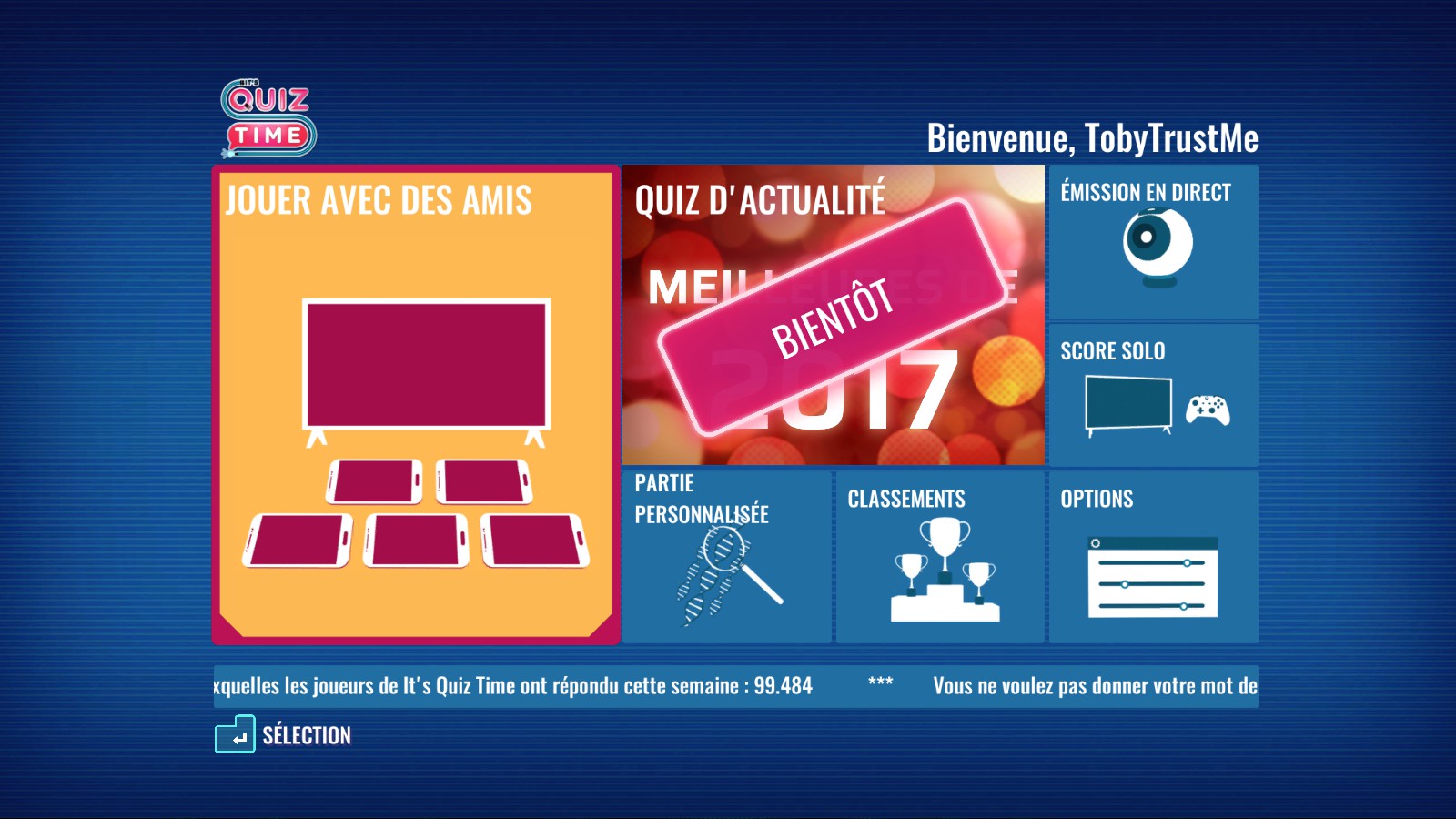Maintenant on reste curieux sur le mode de jeu « Quiz d’actualité ». Est-il réservé à des événements mensuels ? À des compétitions organisées par le studio ? Va-t-elle simplement mettre en œuvre des questions en rapport avec l’actualité chaque semaine, chaque mois ou encore par rapport à des événements spécifiques comme des grands concerts ou des compétitions internationales de sport ? Nous n’en savons absolument rien.