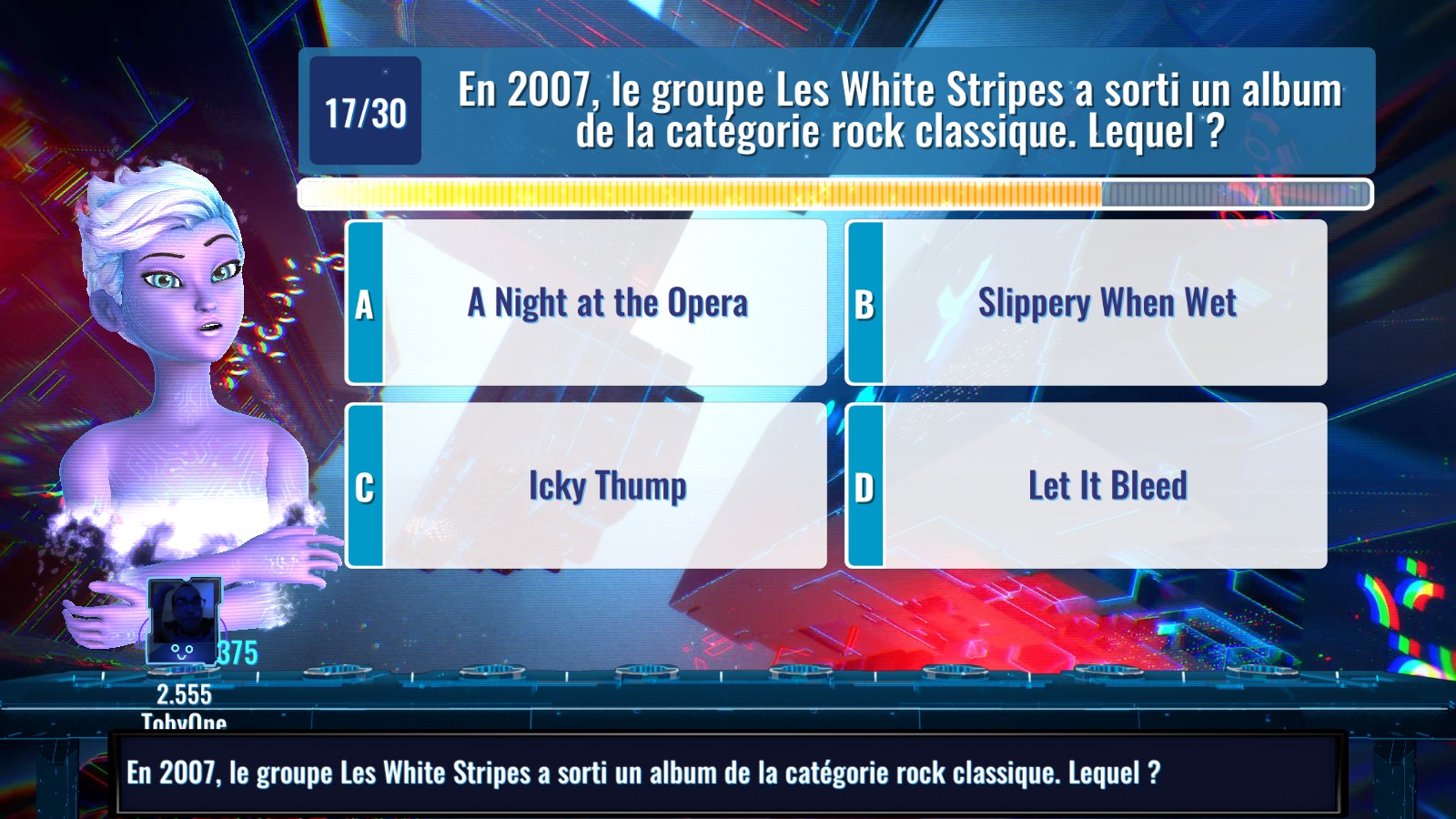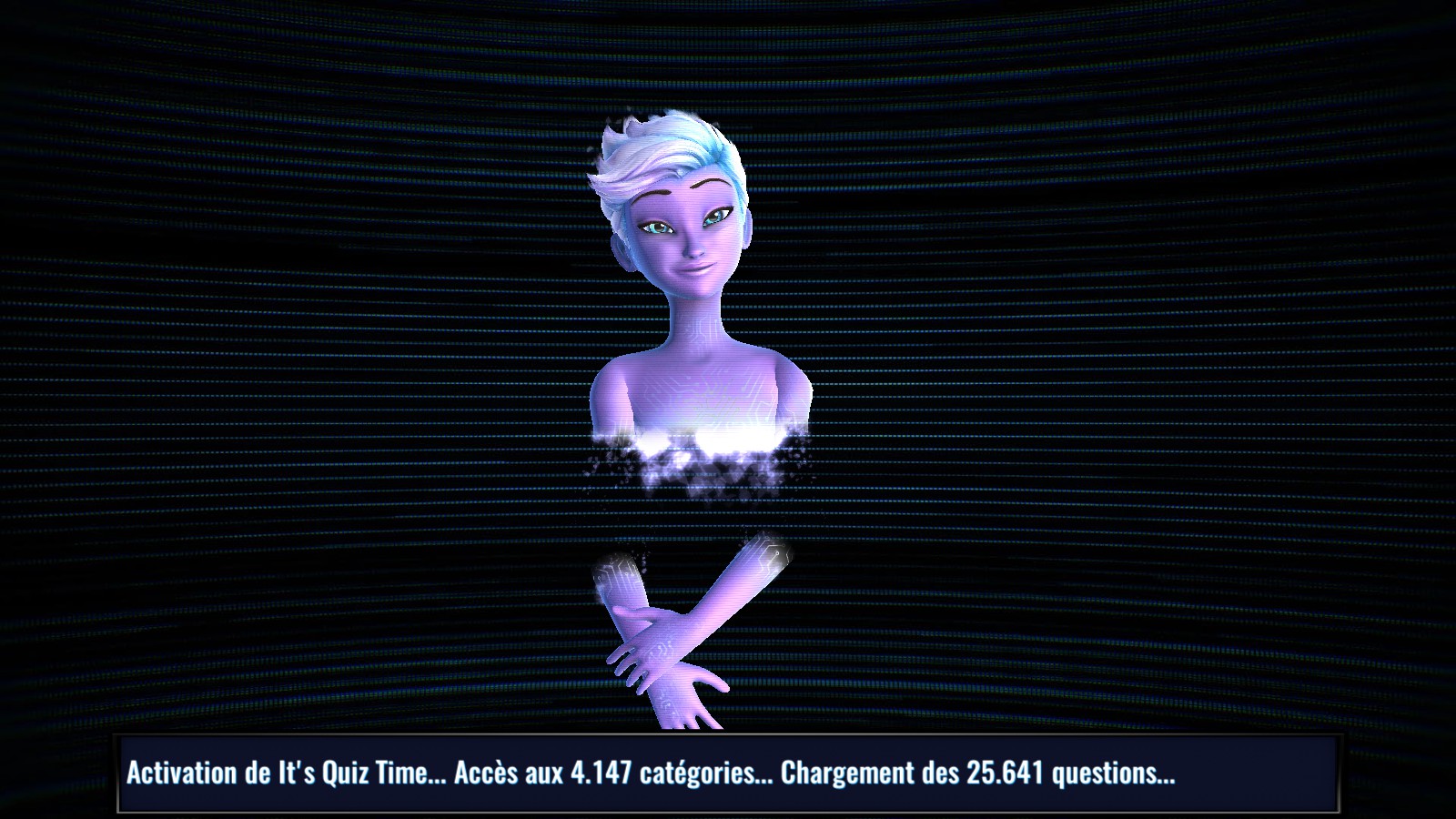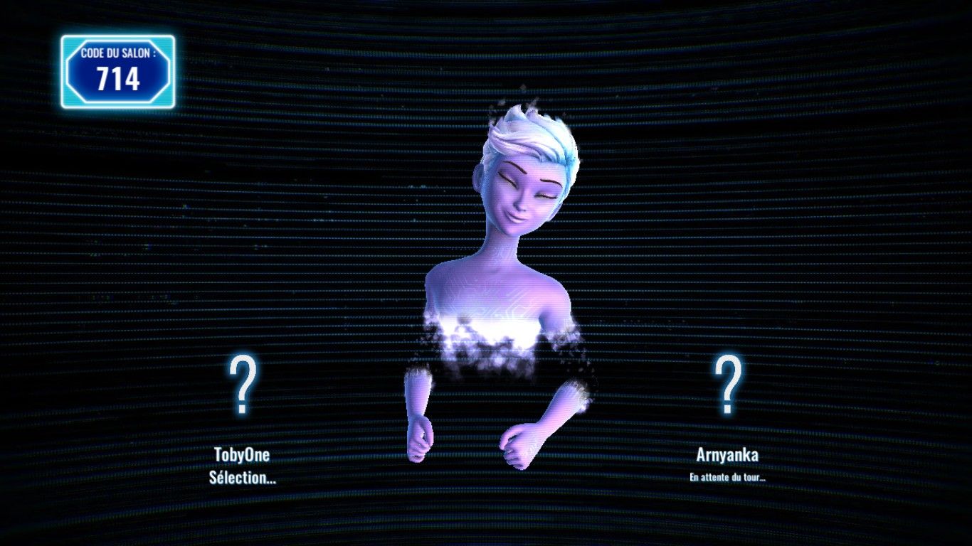 Pour un jeu de quiz, il faut toujours installer le décor. Dans It’s Quiz Time, si l’absence d’un plateau se fait sentir, elle est vite compensée par la prestance de la présentatrice. Dès le premier coup d’œil, elle nous rappelle très vite Elsa du film La Reine des Neiges et elle a bien grandi, sa dose de cynisme avec. Elle parle, elle vanne et on apprécie très vite que la localisation française soit au rendez-vous tant son bagout fait fureur. Ce ne sont pas les rires qui ont manqué suite à ses répliques. Par exemple, avant même que la partie commence, elle vous demande de donner votre âge – des infos utiles à l’élaboration de certaines questions – et elle ne manquera pas de lancer « À votre année de naissance, vous avez indiqué 1989. Ne vouliez-vous pas plutôt dire 1979 ? ». Et vlan ! Dix ans dans la tronche et première pique lancée à un candidat. L’impression de ne pas faire face à une présentatrice aux discours scriptés s’émancipe parfois pour le bien de l’ambiance dans la salle.
