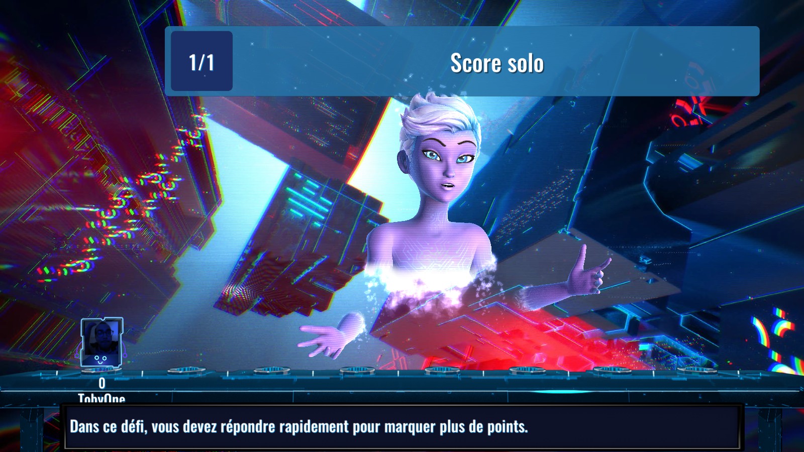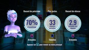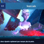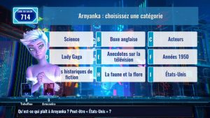 Autre chose, elle profite de quelques animations – parfois à ajuster – qui la rendent vraiment unique et plaisante à regarder. Les regards maléfiques parfois, mais aussi juste une présentatrice qui s’enjaille avec quelques mouvements, qui se croit dans Minority Report quand elle passe d’une manche à une autre. Pour le coup, le seul bémol concerne uniquement les joueurs en eux-mêmes qui ne bénéficient que d’une photo en avatar et d’une petite place en coin mais les développeurs ont fait le choix de la clarté des questions et de l’organisation du jeu. Parlons-en d’ailleurs.