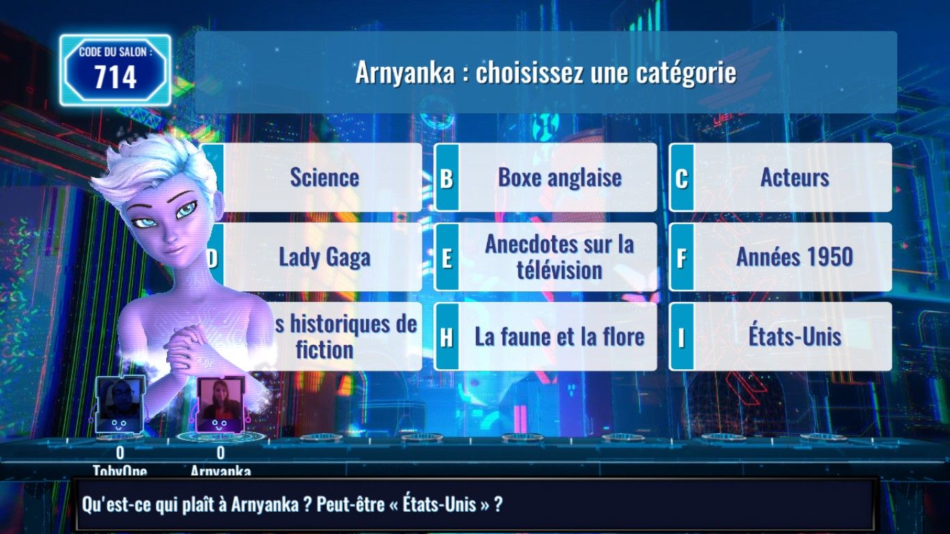 Dès l’arrivée sur le menu, nous sommes curieux sur les modes affichés à l’écran. D’un côté, on vous propose de jouer seul et de l’autre contre la planète entière en streamant votre partie, ce qui est un réel plus pour la communauté d’aujourd’hui très enclin à se lancer en direct et jouer à plusieurs. Quand on se lance dans la partie solo, on relève le défi de répondre à 30 questions dans les règles du Final. Vous choisissez aussi un sujet favori qui vous permettra d’avoir des points bonus en cas de réponse correcte (et des points en moins si ce n’est pas le cas). À côté, vous êtes en mesure de lancer une émission en direct, avec la condition de vous filmer avec votre webcam. Si vous n’avez pas l’équipement nécessaire, vous pouvez juste utiliser un avatar mais si vous n’avez pas de compte Twitch, Mixer ou autre, impossible de lancer. On regrette d’ailleurs qu’il n’y ait pas de hub pour rechercher des parties. Cela fonctionne par code et vous devrez donc chercher sur les plateformes de streaming des vidéastes qui se lancent dans le jeu et acquérir leur code via leur stream. Ce qui n’est pas pratique du tout.