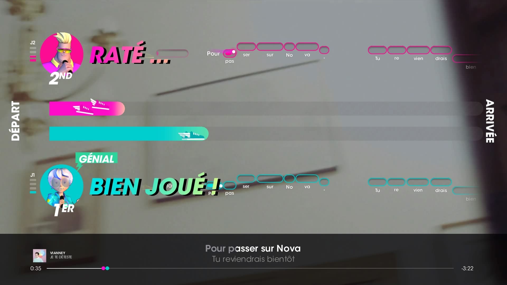 Ce qui demeure agréable, c’est que l’on sent l’effort réalisé par Voxler pour divertir le joueur. Les quatre mini-jeux invitent ainsi à chanter de façon juste (oui cela peut être difficile) lorsque l’on doit éviter que nos fausses notes fassent éclater une bombe. Une autre variante nous a plutôt plu car elle s’avérait difficile et nécessitait une certaine vigilance en plus d’être concentré. Dans celui-ci, le score était représenté telle une course de 110 m haies. C’est-à-dire que plus on chante juste, plus on va vite mais attention, les obstacles forcent à stopper son chant au moment où l’écran vous le dit. Plutôt rigolo et déconcertant car ce n’est jamais au même moment. Ensuite, le mode mixtape avec un mix de plusieurs chansons. Enfin, le mode classique où les paroles deviennent cryptées, et il faut vraiment les connaître par cœur. On se situe alors entre désarroi et amusement.