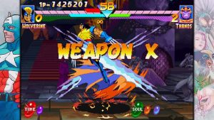 En terme de gameplay c’est assez simple, on se retrouve sur du Street Fighter 2 (même commandes à bases de 1/4 de cercles) avec des ulti qui se lancent une fois la barre chargée au bon niveau. Et super-héros oblige, tout est plus coloré, rapide, (en plus il y a un mode turbo pour chaque jeu) et impressionnant à l’écran, on balance des pouvoirs qui en font la taille, ça saute partout et très haut, et les héros sont bien retranscrits dans leurs palettes de coups et d’animation. J’ai pris un coup de vieux en me faisant mettre à l’amende par l’IA, elle est très énervée, défend très bien, trop bien peut-être alors n’ayez pas peur de débuter en facile.