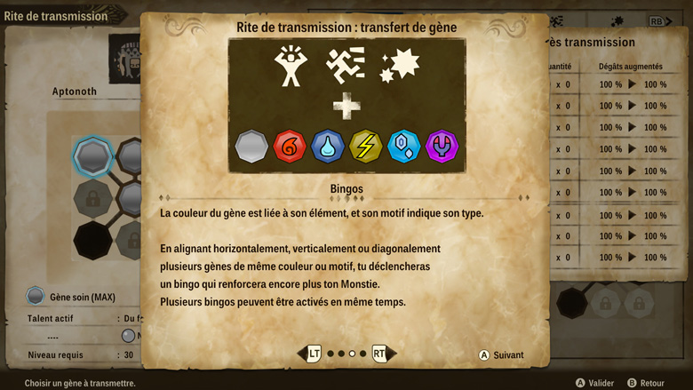 Pour le reste il va falloir farmer un peu et notamment les quêtes annexes disponibles au tableau de chaque village visité pour avoir suffisamment de ressources pour vous équiper et pour trouver des œufs plus rares, vous permettant de disposer d’une équipe équilibrée vous permettant, hors combat, d’interagir avec tous les types de décor rencontrés, et en combat d’avoir un avantage et des monsties puissants. Et pour les renforcer vous pourrez en « sacrifier » certains pour transmettre des gènes utiles à voter équipe de rêve. Une grille de 9 traits sera ainsi à remplir avec un minimum d’optimisation.