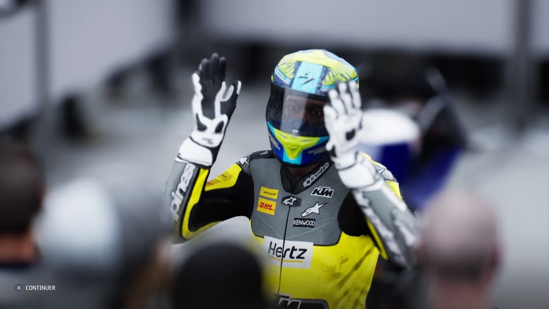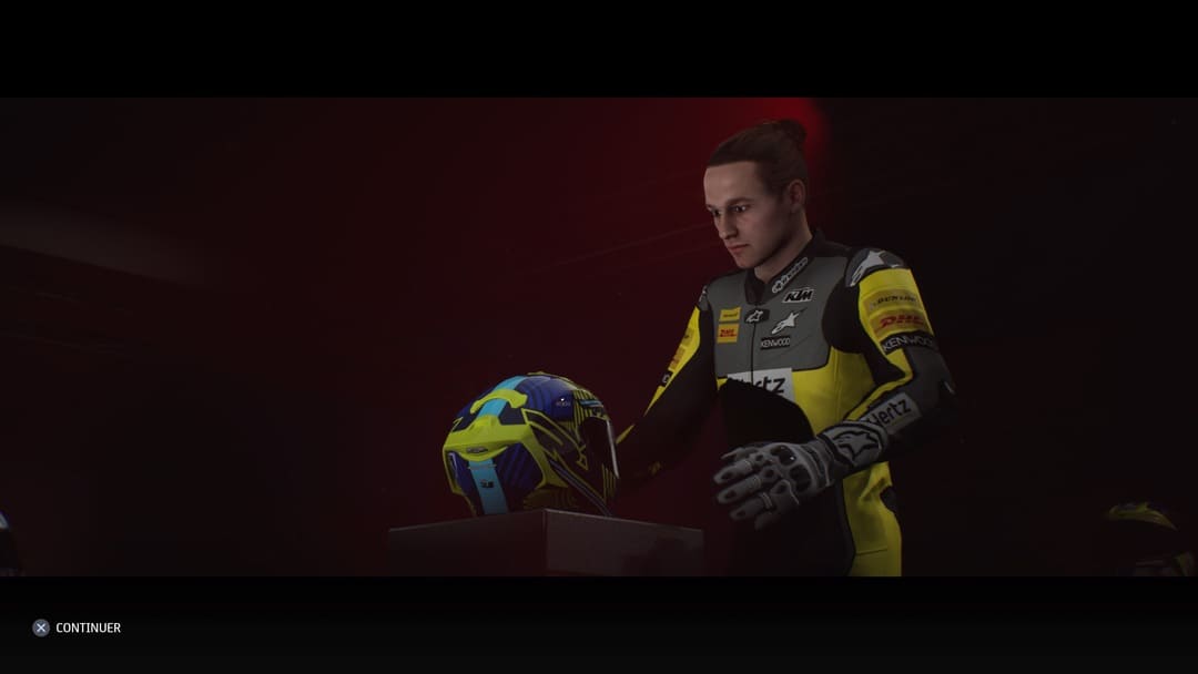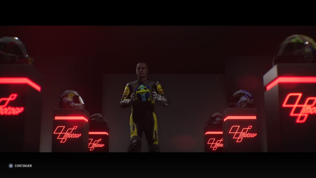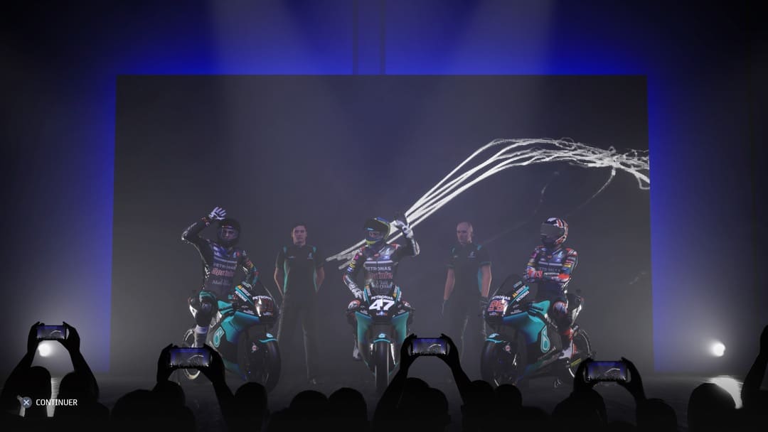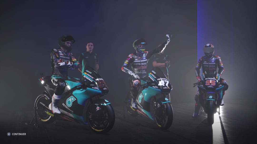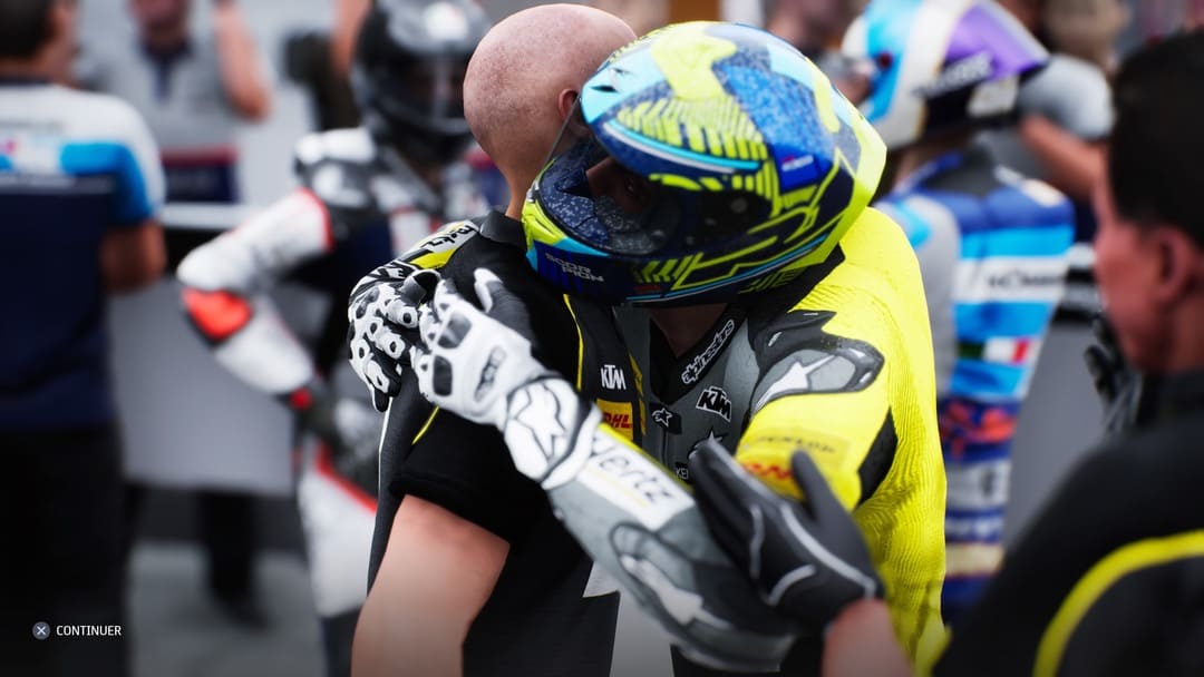 On remarque que MotoGP 21 intègre des cinématiques dans les prémices de la saison puisque vous serez présenté au volant de votre moto devant la presse. L’effet et la mise en scène sont minimales mais ça reste toujours un plus d’y avoir pensé. De ce point de vue-là, on sera heureux de nous voir en train de célébrer un podium ou la victoire après une course mais déçu de ne pas voir de podium au moment de la célébration inaugurale, du moins en moto3. Le reste est classique, il n’y a pas de discussion entre votre team et vous pendant la semaine. Vous décidez qui mettre où pour améliorer tel ou tel domaine. On vous fixe à travers un tableau les objectifs. Si jamais vous les remplissez, vous gagnerez des points mais on y reviendra. Les négociations sont logées à la même enseigne, malgré la présentation, ça fera très Excel comme processus.
