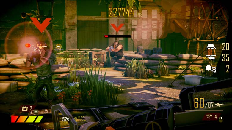 Car il y a un accessoire qui se prête bien au jeu du rail : la réalité virtuelle. Et si Operation Wolf Returns First Mission propose un mode coop et un mode survie, il permet donc d’enfiler un casque pour devenir un John Rambo sous stéroïdes (Expendables 4 bientôt au cinéma). On tire, on ne s’occupe pas du déplacement donc pourquoi pas.
