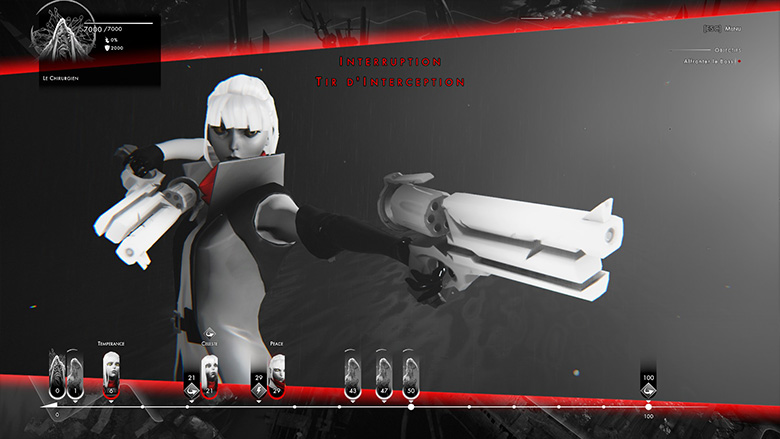 Si le gameplay d’Othercide est plutôt plaisant et bien ficelé, c’est surtout au niveau de sa direction artistique que celui-ci brille de tous ses éclats. Si l’usage de seulement 3 couleurs dont le noir et le blanc avait de quoi rendre admiratif sur les premières images mais dubitatif à l’idée de voir ce choix perdurer sur le long terme, il est désormais évident que ce choix de couleur passe étonnamment bien même après plus de 10h de jeu. L’usage des dégradés de gris, qui s’ajoute à une parfaite maîtrise du clair-obscur, est ici très intelligent et permet de conserver une excellente lisibilité dans l’action ou en dehors. L’interface, d’ailleurs, est très claire, à l’image des polices employées dont la simplicité permet une bonne lecture des menus (même si on regrettera une taille de texte qui sera peut-être gênante pour les malvoyants, les options permettant de ne régler que la taille des sous-titres). Ajouté à une bande-son riche qui fait la part belle au rock symphonique et qui a la bonne idée de gagner en intensité à certains moments-clés des combats les plus rudes, Othercide est un véritable bijou sur le plan artistique. Une de ces claques créatives pleine d’audace que la scène indé adresse de temps en temps aux grands darons du triple A.