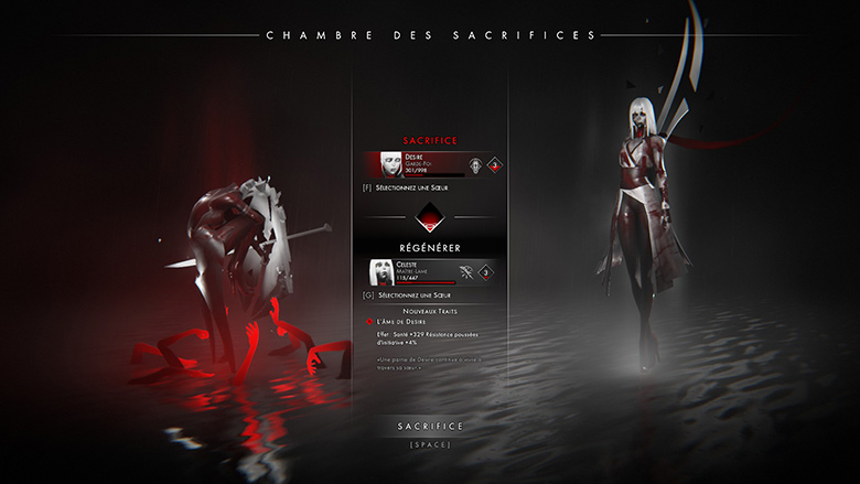 Et ce n’est pas qu’une question de forme : le corps artistique d’Othercide est aussi d’une grande richesse, que ce soit au niveau de l’atmosphère globale ou de l’histoire qui se dévoile petit à petit pour ne pas inonder le joueur avec un trop-plein d’information. L’univers typé 19ème siècle avec des touches de fantasy teintées d’incursions démoniaques est également une grande réussite et réussit à nous faire évoluer en terrain connu tout en proposant ses propres innovations apporté au genre. Bien qu’on regrette que les Sœurs ne soient parfois pas toujours très variées au niveau de l’attirail cosmétique (une critique qui ne concerne toutefois pas les similitudes faciales qui s’expliquent par leur nature), il est compliqué de ne pas tomber sous le charme du chara-design tantôt angélique et tantôt horrifique et brutal de l’ensemble du casting d’Othercide. Et de manière globale, on apprécie la grande cohérence des choix visuels effectués, notamment avec ce rouge vif, discret mais omniprésent, qu’il est difficile de ne pas voir comme le symbole du sang et de la vie évoluant au milieu d’un monde terne, sombre, et ravagé par la mort. Par ces choix singuliers et totalement pertinents, Othercide est assurément une expérience dont on se souviendra longtemps.