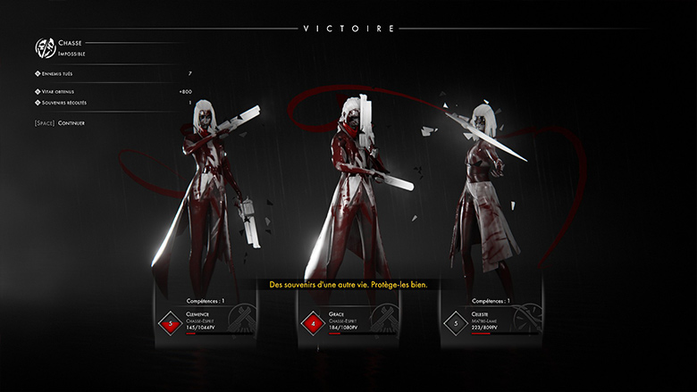 Comme dit plus haut, la progression dans Othercide n’est pas linéaire. Celle-ci se découpe en plusieurs ères qui sont chacune dominées par un boss précis, et battre ces derniers vous permettent de passer à l’ère suivante. Cependant, si vous échouez en perdant toutes vos Sœurs ou si vous décidez manuellement d’abandonner la partie, vous réinitialiserez toute votre progression. Malgré tout, au fil des réinitialisations, vous cumulez des fragments, une forme de monnaie qui vous permet d’activer des bonus débloqués au fur et à mesure de vos combats. Ces bonus (plus de points de vie, meilleur niveau de démarrage pour les nouvelles Soeurs, bonus d’XP, etc.) vous permettent ainsi de revenir à chaque fois plus forts, voire de passer les ères dont les boss ont déjà été vaincus. Si Othercide est un jeu assez difficile et punitif, il sait malgré tout récompenser la patience et la persévérance, et c’est au bout de plusieurs heures de jeu qu’on commence enfin à se sentir capable d’en voir le bout