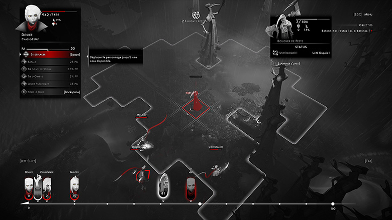 L’univers d’Othercide se veut sombre et violent, et le choix graphique d’un jeu en noir et blanc accompagné d’une fine touche de rouge vient donner du corps à son propos, tout en rendant le gore subtil à la manière du Sin City de Frank Miller. Concrètement, Othercide se présente comme un jeu de stratégie en vue isométrique assez similaire aux combats d’un XCOM ou d’un Shadowrun, à la différence que le titre du studio français ne s’embarrasse pas de couvertures défensives et privilégie une action soutenue au sein de laquelle vous êtes constamment exposés à l’ennemi. Mais Othercide est également un bon Die & Retry des familles, avec un gameplay qui ne vous laissera pas progresser de façon linéaire et qui vous forcera à abandonner la partie d’une manière ou d’une autre – pour mieux recommencer. La mort est ici inévitable, et vos Sœurs l’apprendront à leurs dépends…