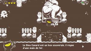 Ponpu propose plusieurs modes de jeu, un mode histoire tout d’abord, qui devrait vous prendre entre 2 et 4 heures, qui vous demandera de venir à bout de 6 mondes découpés en niveaux. Il vous faudra trouver des clefs et bonus cachés, battre ennemis et boss et éviter les pièges disséminés au fil des tableaux composants les niveaux. Exit la présentation sur un seul tableau géant, on se retrouve en mode exploration. Mais le mode histoire peut s’avérer frustrant à plusieurs égards. Ponpu dispose d’un gameplay ou plutôt d’une maniabilité rigide, et la cause principale de décès dans le mode solo sera le suicide, dû à une mauvaise utilisation du dash, ou plus souvent au fait que vous ne faisiez pas face à la bonne direction avant de poser/lancer votre œuf bombinette.