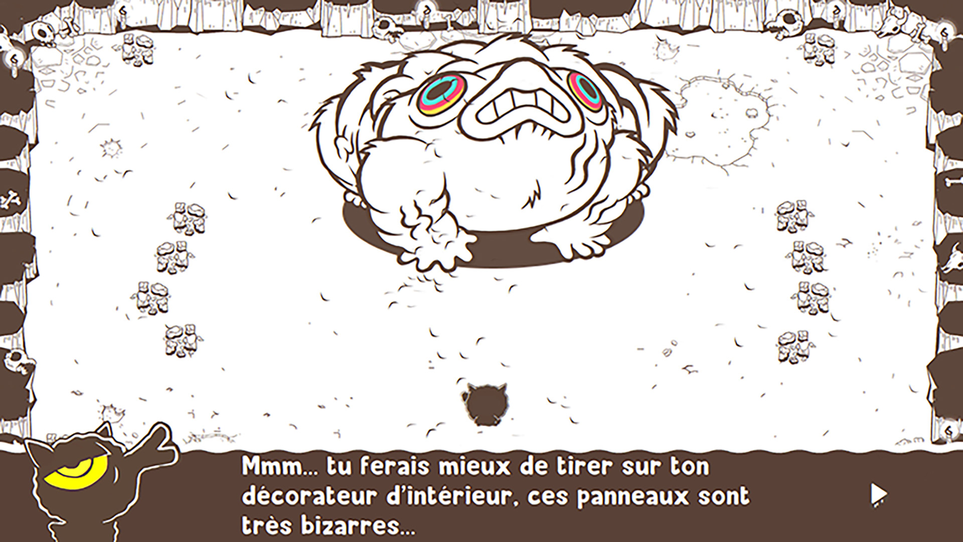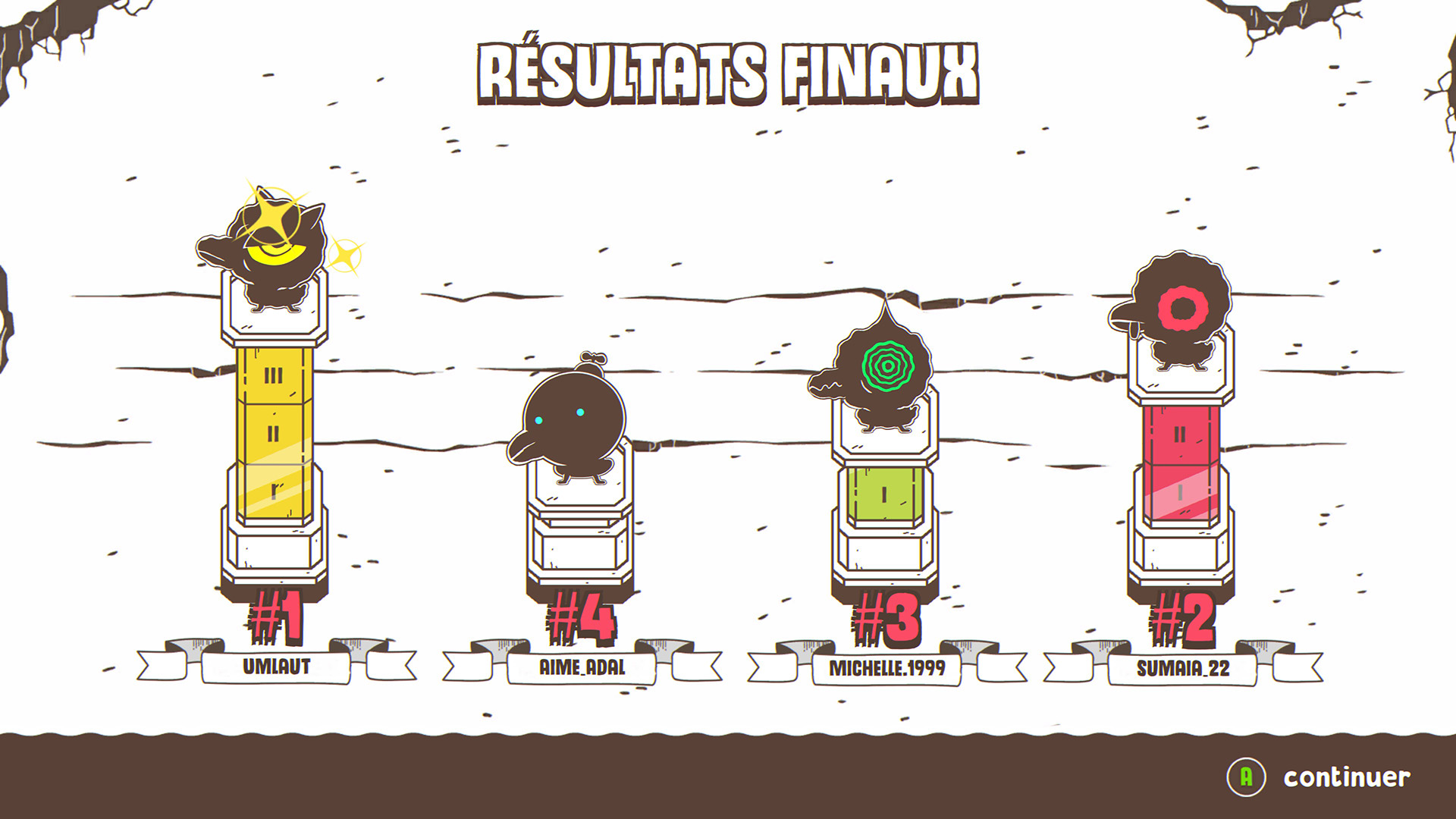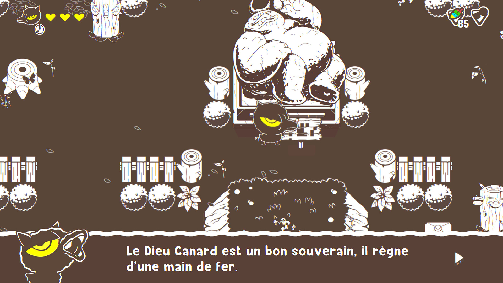 Ponpu propose plusieurs modes de jeu, un mode histoire tout d’abord, qui devrait vous prendre entre 2 et 4 heures, qui vous demandera de venir à bout de 6 mondes découpés en niveaux. Il vous faudra trouver des clefs et bonus cachés, battre ennemis et boss et éviter les pièges disséminés au fil des tableaux composants les niveaux. Exit la présentation sur un seul tableau géant, on se retrouve en mode exploration. Mais le mode histoire peut s’avérer frustrant à plusieurs égards. Ponpu dispose d’un gameplay ou plutôt d’une maniabilité rigide, et la cause principale de décès dans le mode solo sera le suicide, dû à une mauvaise utilisation du dash, ou plus souvent au fait que vous ne faisiez pas face à la bonne direction avant de poser/lancer votre œuf bombinette.