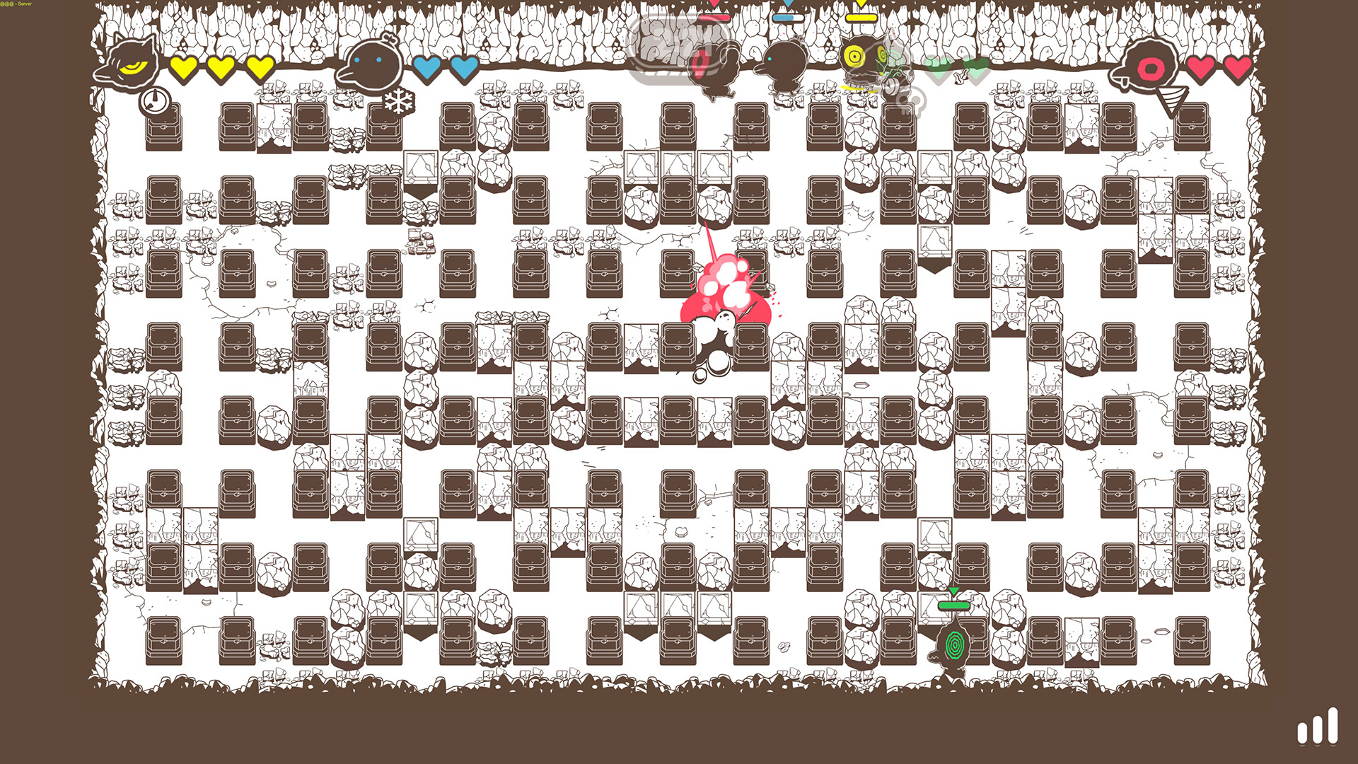Au revoir les petits-robots, bonjour aux petits canards pas vraiment mignons mais à l’esthétisme original et accrocheur. Pour le principe c’est le même, les bombes spéciales ayant été remplacées par des œufs spéciaux à choisir avant de rentrer en jeu : Poison, Télécommandé, Gel, Foreuse.