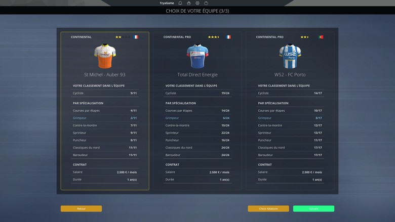 Continuons dans l’inhabituel. Puisque je préfère toujours me lancer dans la carrière d’une équipe et gérer le calendrier et chaque course, je change et je me lance en solo sur les tracés concoctés par Cyanide. Autant se l’avouer, on reste dans la veine de PCM 18 dans les grandes lignes. Par contre, on souligne tout de même une interface plus moderne, simplement plus lisible. Les tutoriels sont encore au rendez-vous et on vous laisse le choix de les lire ou de les zapper si vous êtes un habitué. Pour l’étrange, fait étonnant lors de la personnalisation de son coureur, on vous indique la possibilité de choisir l’âge mais bug ou non, impossible de réaliser ce choix. Après, cela reste secondaire et pas vraiment important. Votre premier choix important intervient au niveau de l’équipe dans laquelle vous commencerez votre carrière. De notre côté, on est allé du côté d’Auber en Continental.