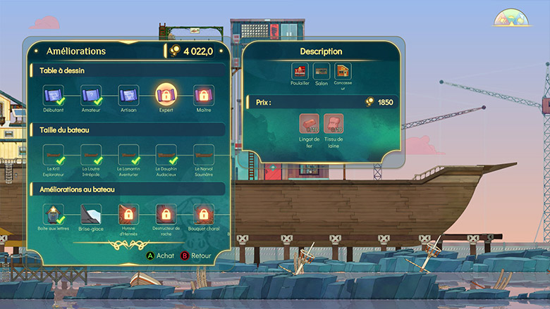 Si effectuer toutes les validations au bouton X (ou ☐) est un peu compliqué au début pour tout.e joueur.se habitué à valider ses choix avec A (ou la croix), le gameplay se veut rapidement accessible avec une palette de contrôles assez simple. Entre chaque voyage, Stella a ainsi la possibilité de larguer les amarres pour visiter différents types d’îles sur lesquelles elle a la capacité de sauter, planer, voire bondir afin d’explorer et découvrir les mystères et les trésors qu’elles renferment. Ces compétences se débloqueront d’ailleurs au fur et à mesure afin d’encourager la joueuse ou le joueur à revenir plus tard pour atteindre des zones qui lui étaient auparavant inaccessibles. La mer, également, se divise en plusieurs parties, séparées par plusieurs types d’obstacles naturels (glace, récifs rocheux, brume) qui permettent de juguler l’exploration en instaurant un ordre de progression. Et à ce sujet, les améliorations disponibles au chantier naval d’Albert (qui nécessiteront d’avoir des ressources précises en poche) seront incontournables pour continuer l’aventure.