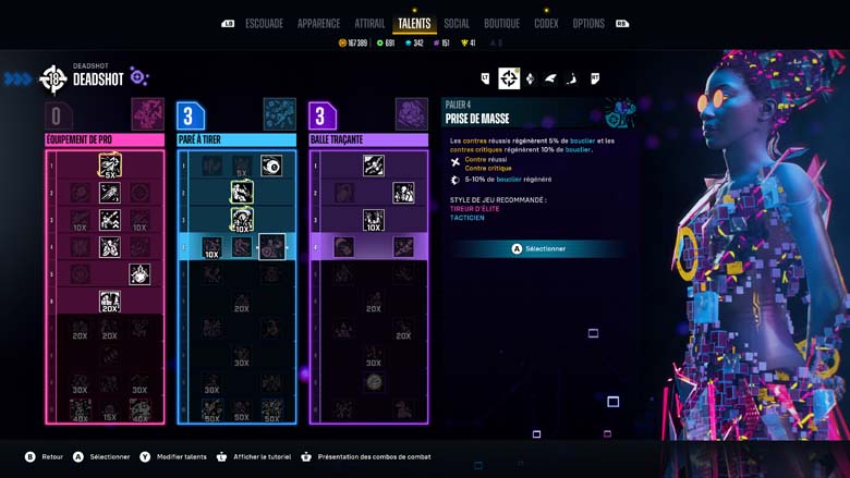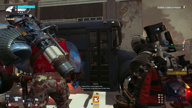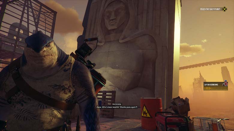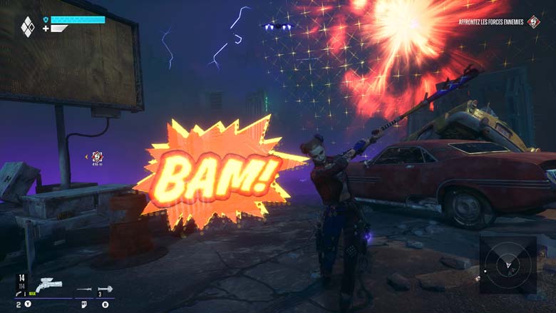 Ces effusions de tirs et d’explosions ultra colorées vont êtres menées par une équipe de 4 vilains, King Shark (une grosse brute) Deadshot (un tireur d’élite), Harley (agilité et finesse) et un Captain Boomerang boosté à l’énergie véloce. 4 personnages que vous pourrez incarner en changeant le lead entre chaque mission mais 4 personnages au gameplay identique, qu’il faudra pourtant jouer alternativement si vous voulez les upgrader car l’attribution de points de compétences ne se fait que sur le personnage contrôlé. En coopératif les doublons seront possibles et l’expérience sera même joyeuse tant l’IA est inexistante. Ne comptez que sur vous et vous seul pour les combats de boss par exemple, boss à la mise en scène tout juste sympathique mais à l’expérience oubliable. Pourtant l’occasion était belle de nous faire vivre des twists intéressants en contrant les pouvoirs des héros, mais non occasion manquée.