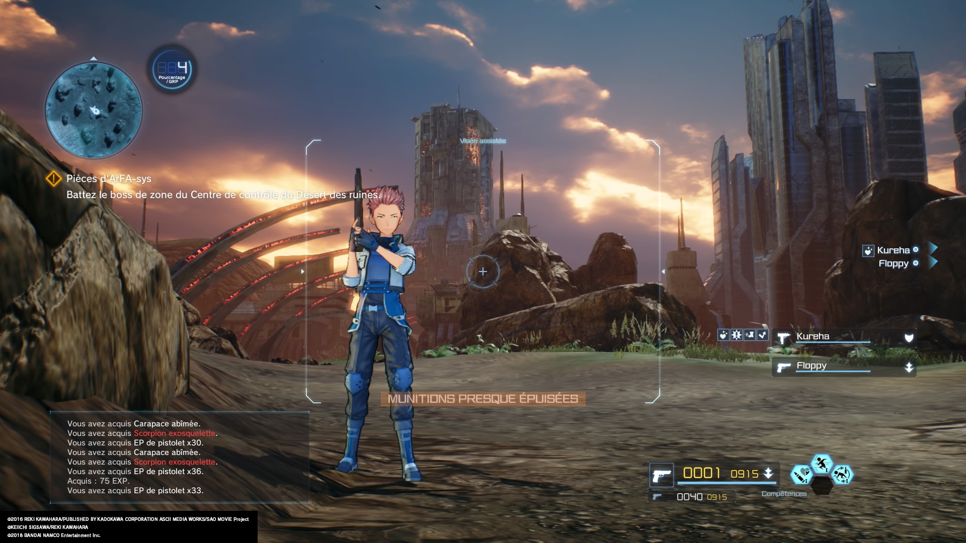 Ceci dit, avant d’être vraiment plongé dans la ville du VRMMORPG GGO, le jeu débute par un tutoriel d’une bonne demie-heure qui fait le tour du gameplay. Ce tutoriel s’achève sur l’événement majeur de ce début partie, soit la découverte d’une étrange intelligence artificielle Arfa-Sys. Plutôt commune dans le jeu, celle-ci est d’une rareté exceptionnelle qui attirera toutes les convoitises. Après l’avoir renommée et passée à l’éditeur de personnalisation, elle sera votre acolyte aux côtés de Kureha.