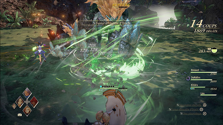 Au niveau du gameplay, Tales of Arise se présente peu ou prou comme un J-RPG classique avec les spécificités propres à sa licence. On retrouve ici un système de combat dynamique en simili-temps réel directement inspiré de celui de ses prédécesseurs. « Simili-temps réel », car il ne s’agit pas ici de tartiner les ennemis à même la map : chaque rencontre vous transporte assez classiquement au sein d’une arène dans laquelle vous pouvez par contre vous battre en temps réel. Les combats sont ici très dynamiques, avec toute une panoplie de compétences à déployer pour vaincre vos adversaires. Il est ainsi possible d’enchaîner des « artes » (des compétences variées aux effets divers), des attaques spéciales disponibles après un certain temps, ainsi que de faire appel au « hors-limite », une jauge qui apparaît après avoir reçu ou infligé suffisamment de dégâts. Cette jauge permet de balancer sans limite vos artes sur le coin de la tronche des vos ennemis pendant qu’elle se vide. Et avant cette fin de jauge, il est encore possible de déclencher une autre attaque spéciale. Bref, il y a de quoi faire, surtout qu’il est agréable de constater que les personnages sur le banc peuvent participer aux affrontements dans une moindre mesure via la possibilité de faire appel à leurs attaques spéciales.