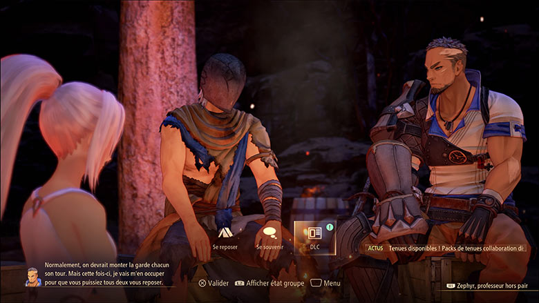 Cette évolution relationnelle progressive, en plus de l’écriture individuelle maîtrisée, est sans aucun doute ce qui rend cette équipe si attachante. Les personnages de Tales of Arise, en effet, sont adorables, empathiques et dotés d’une grande sensibilité – en plus de leurs animations faciales réussies malgré leur simplicité apparente ; et on se surprend à traquer la moindre saynète survenant pendant l’exploration pour les voir interagir entre eux au sein de dialogues qui peuvent s’étendre du sérieux jusqu’à l’humoristique. Un système de renforcement de liens avec le protagoniste existe d’ailleurs via le feu de camp, ce qui rallonge le nombre de mini-scènes disponibles. La confection de certains bons petits plats, elle aussi, peut engendrer des dialogues supplémentaires.