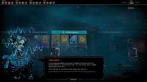 Votre équipe se compose de plusieurs personnages aux capacités et motivations diverses disposant d’une feuille de personnage pour vous permettre de comprendre quelles tâches leur assigner. Prenant le support d’un jeu de cartes, The Horror at Highrook va mettre à disposition des supports, pour améliorer lesdites capacités (cuisine, alchimie, mécanique, …), supports qui permettront de résoudre des actions qui sont à réaliser dans des pièces spécifiques. Ces actions vont alors générer, des provisions, des matières premières, des indices ou rien du tout si vous avez déjà atteint votre seuil de supports / matières premières, évitant ainsi que vous stockiez pour speedrunner le jeu.