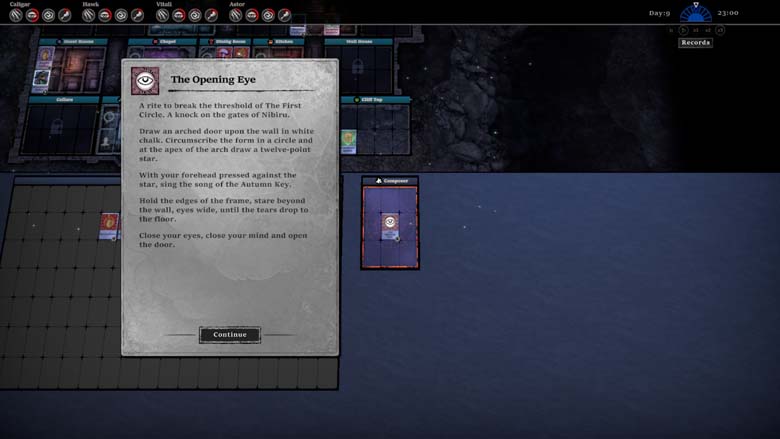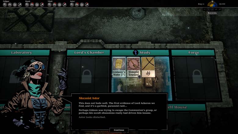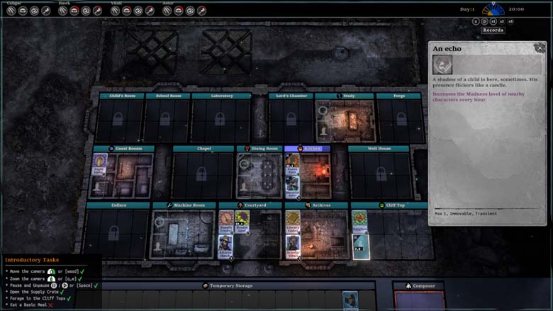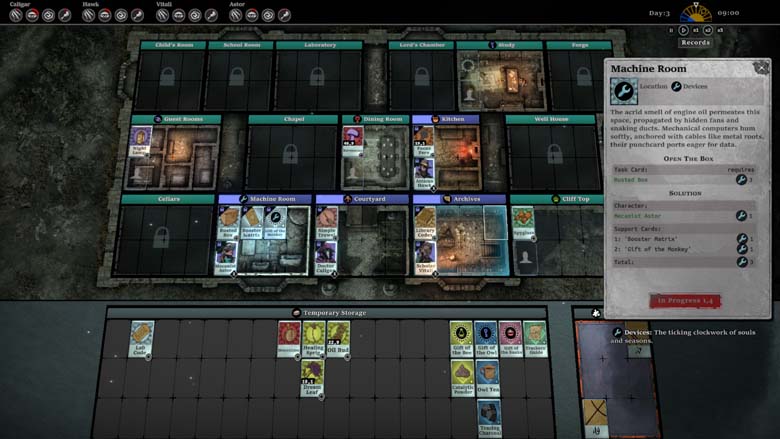 Votre équipe se compose de plusieurs personnages aux capacités et motivations diverses disposant d’une feuille de personnage pour vous permettre de comprendre quelles tâches leur assigner. Prenant le support d’un jeu de cartes, The Horror at Highrook va mettre à disposition des supports, pour améliorer lesdites capacités (cuisine, alchimie, mécanique, …), supports qui permettront de résoudre des actions qui sont à réaliser dans des pièces spécifiques. Ces actions vont alors générer, des provisions, des matières premières, des indices ou rien du tout si vous avez déjà atteint votre seuil de supports / matières premières, évitant ainsi que vous stockiez pour speedrunner le jeu.
