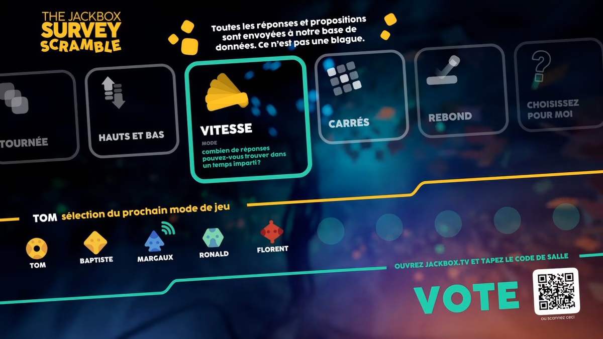The Jackbox Survey Scramble propose alors un tour du monde mettant en scène chacun de ses modes mais vous pouvez aussi y jouer individuellement. Tous laissent transparaître une vibe Famille en Or dans le sens où toutes les questions ont pour but de vous faire deviner ce que la majorité des gens, ayant complétés les sondages, ont pu répondre sur un très vaste panel de sujets.