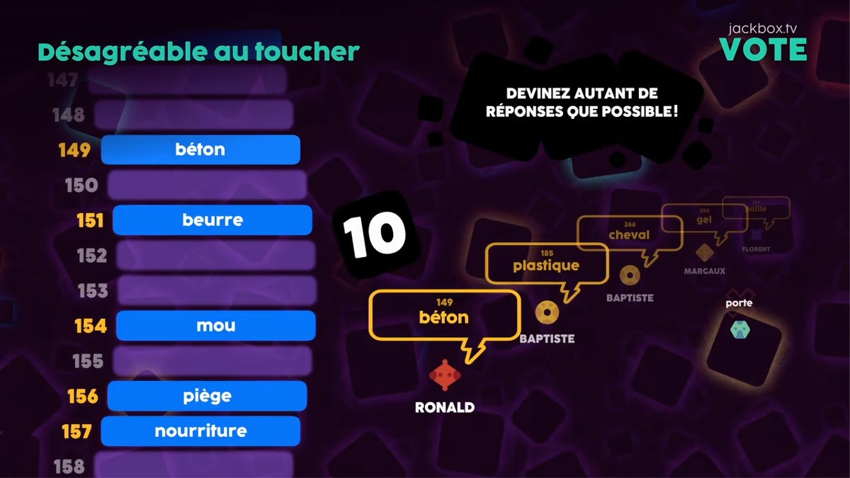 - Rebond – Peut être le mode de jeu le plus difficile et le moins satisfaisant. Deux équipes contrôlent une raquette à la Arkanoïd qui se trouve sur une échelle de réponses allant des plus populaires aux moins populaires. Travaillez en équipe pour deviner une réponse qui place votre raquette au bon endroit afin d’intercepter une balle rebondissante et ainsi empêcher vos adversaires de marquer un point. La balle prend de la vitesse à chaque réponse mais vous devrez entrer plusieurs fois la même réponse si la balle arrive au même endroit, le mode de jeu qu’on passera vite.