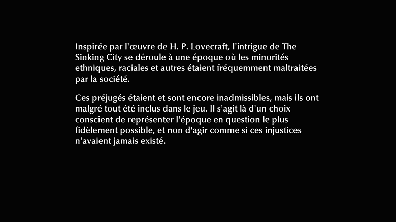 En résumé, malgré mes débuts chaotiques, The Sinking City est un jeu d’enquêtes fascinant. Plus j’avance dans le jeu, plus j’ai envie de jouer au jeu. L’ambiance est pesante juste comme il faut, le mystère autour de la ville est entier, seul bémol pour moi, toutes ces sales bestioles qui me harcèlent pendant que je cherche des indices. Mais depuis que j’ai compris comment m’en débarrasser je passe un bon moment.