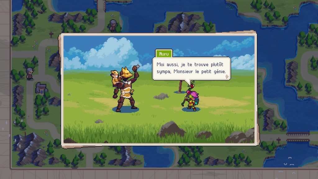 Le style pixel art, qui rappelle aussi Advance Wars, fonctionne à merveille. Le chara-design des unités est réussi et les petites animations qui ponctuent les combats ou les cinématiques sont fluides et agréables à l’œil. L’apparence de certaines des unités varie d’ailleurs d’un camp à l’autre ce qui ajoute un petit plus. C’est bien la seule différence entre elles puisque contrairement à son modèle, Wargroove ne donne pas d’avantage à certains types d’unité en fonction du commandant qui les dirige. L’équité est de rigueur.